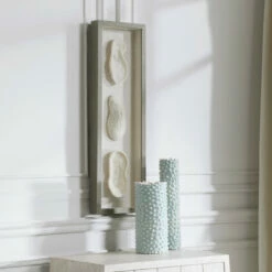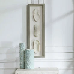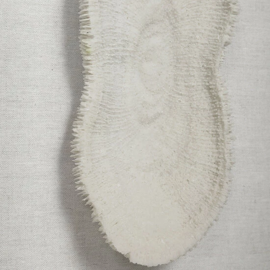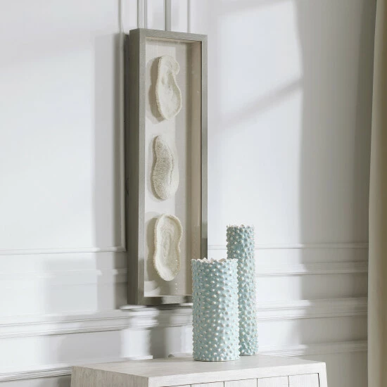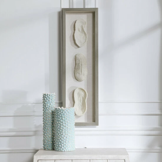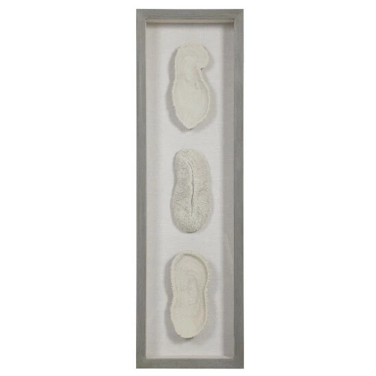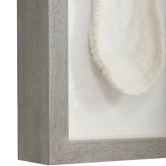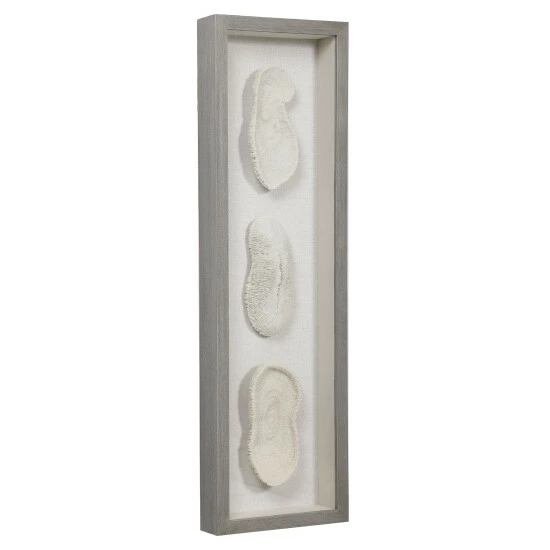 Reminiscent of preserved white coral, this shadowbox design exudes refined coastal style. The shadow box style frame has a light grey finished pine wood exterior with a beige linen backing. May be hung horizontal or vertical.