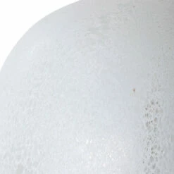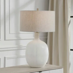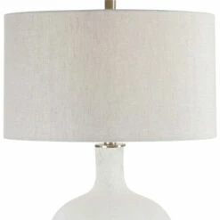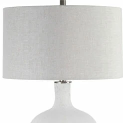 Beautiful and functional, this table lamp features a glass base finished in a heavily textured, mottled aged white, accented by brushed nickel plated details. The round hardback drum shade is a light oatmeal linen fabric with natural slubbing.