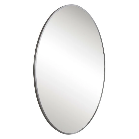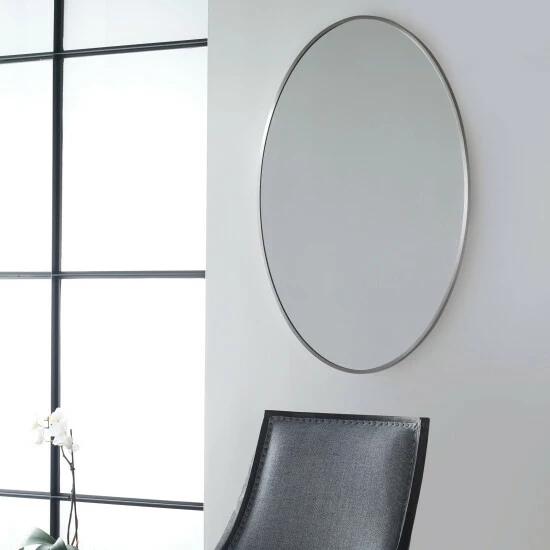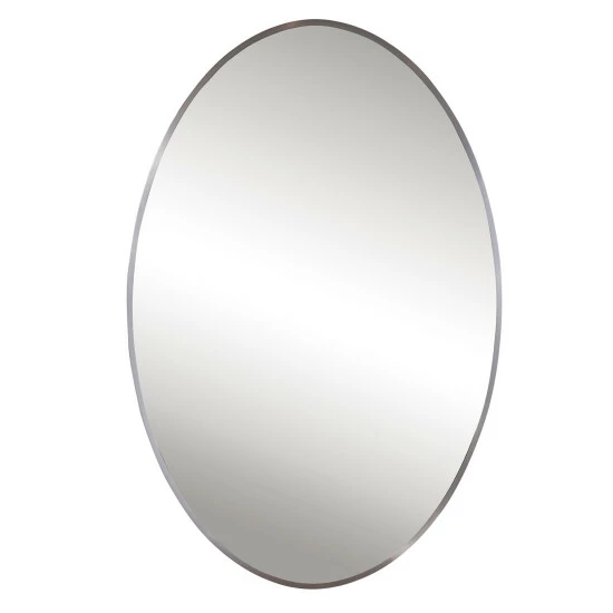 This classic oval mirror features a petite stainless steel frame finished in brushed nickel. May be hung horizontal or vertical.