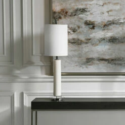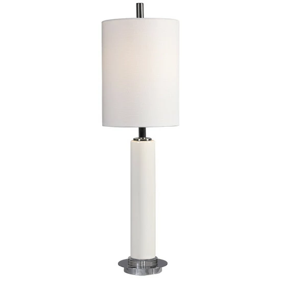 This buffet lamp features a tall ceramic column finished in a neutral ivory crackle glaze that’s paired with polished nickel plated details and a crystal accent. A round white linen hardback shade compliments the lamp.
