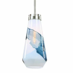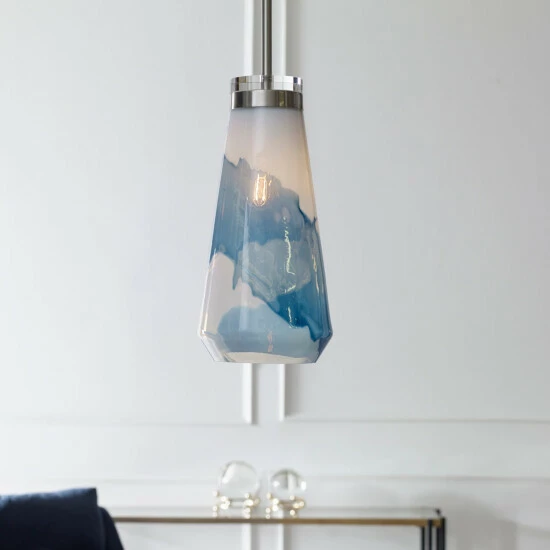 The feeling of windswept sky and clouds are brought to life in this 1 Lt. pendant with a focus to the swirling white and blue handmade glass shade, each piece will have slight variations. Finished in brushed nickel and accented with a subtle crystal disk. 1-60 wattage max Edison socket. Supplied with 15 feet wire, and 3-12 inches stems and 1-6 inches stem for adjustable installation.
