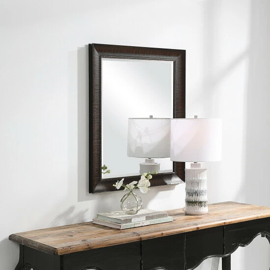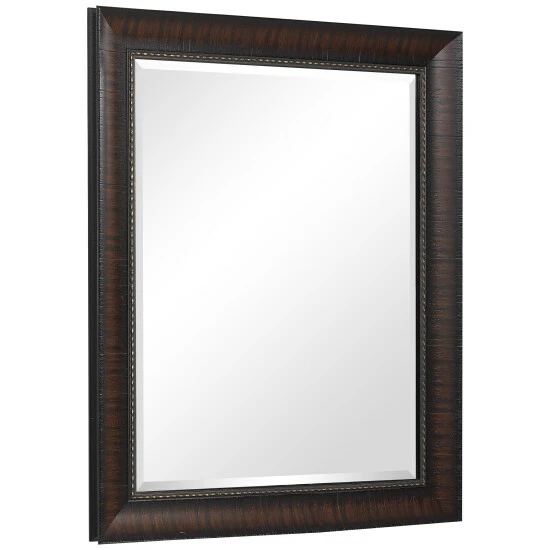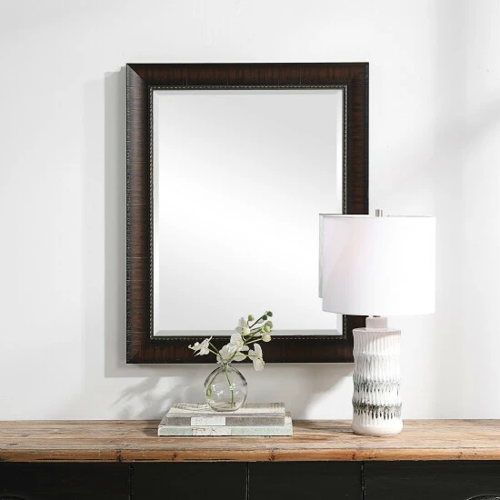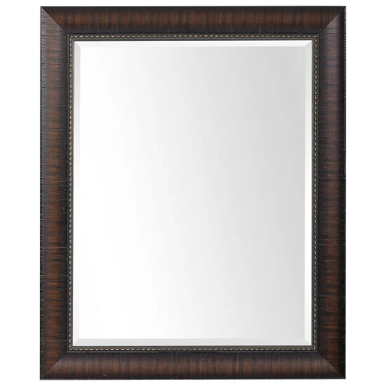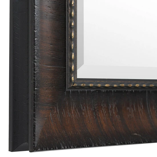 This rectangular mirror features a heavily burnished wood look with rich mahogany undertones, faux exposed wood grain and a beaded inner liner. The piece has a 1-inch bevel and may be hung horizontal or vertical.