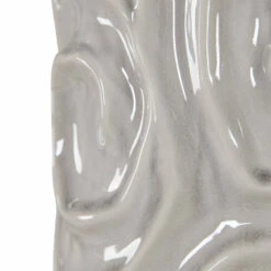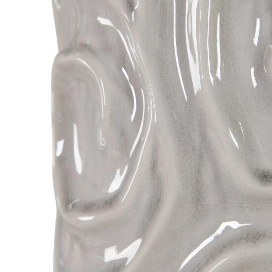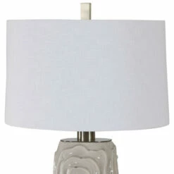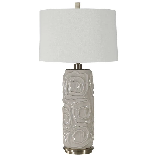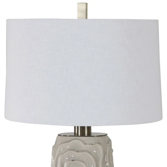 This ceramic table lamp features a geometric patterned design and is finished in a light warm grey crackled glaze, accented with brushed nickel hardware. The tapered drum shade is a white linen fabric with natural slubbing. Due to the nature of fired glazes on ceramic lamps, finishes will vary slightly.