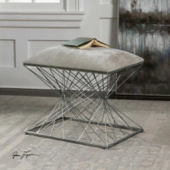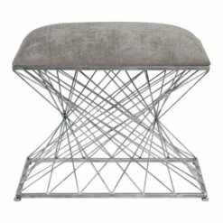 Bursts of sturdy iron rods create a unique base for this accent stool in a burnished silver finish topped with a padded seat in a stony grey chenille fabric.